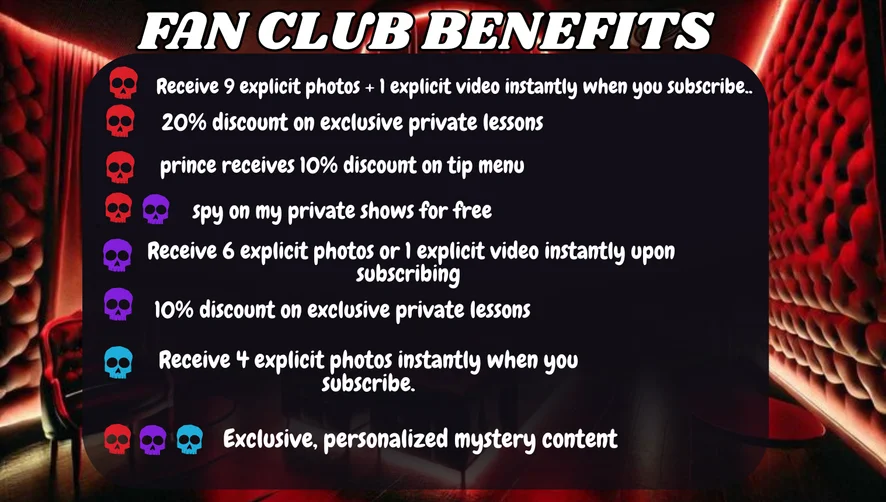 Erotický tanec, Hodnocení péra, Striptýz, Footfetish, Flexing, Kouření, Masáž, Masturbace, Honění, Olejová show, Sebeuspokojování ústy, Plácání po zadku, Nevěra, Špinavá mluva, Ejakulace, Orgasmus, Hardcore, Polykání, Sexuální hračky, Líbání, CEI, Exhibicionismus, Ponižování, Pokyny k masturbaci, Roleplay, Výstřik, Velbloudí palec